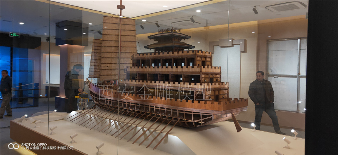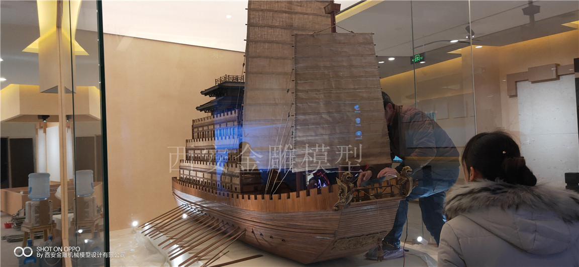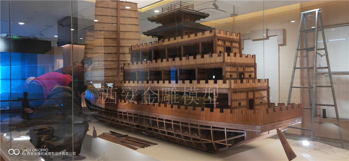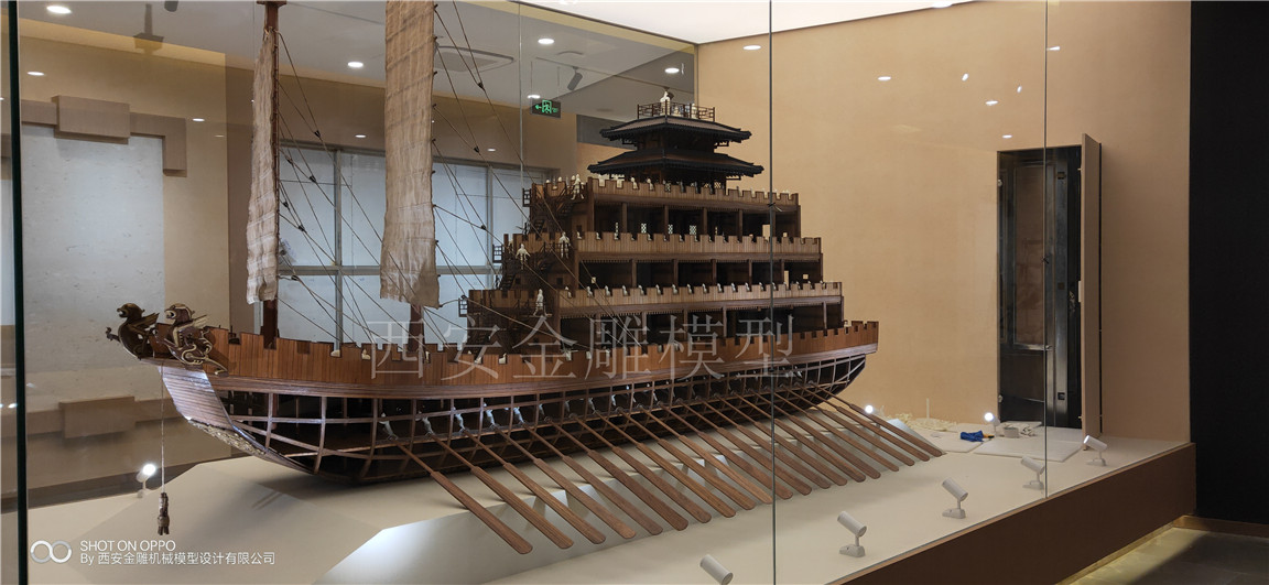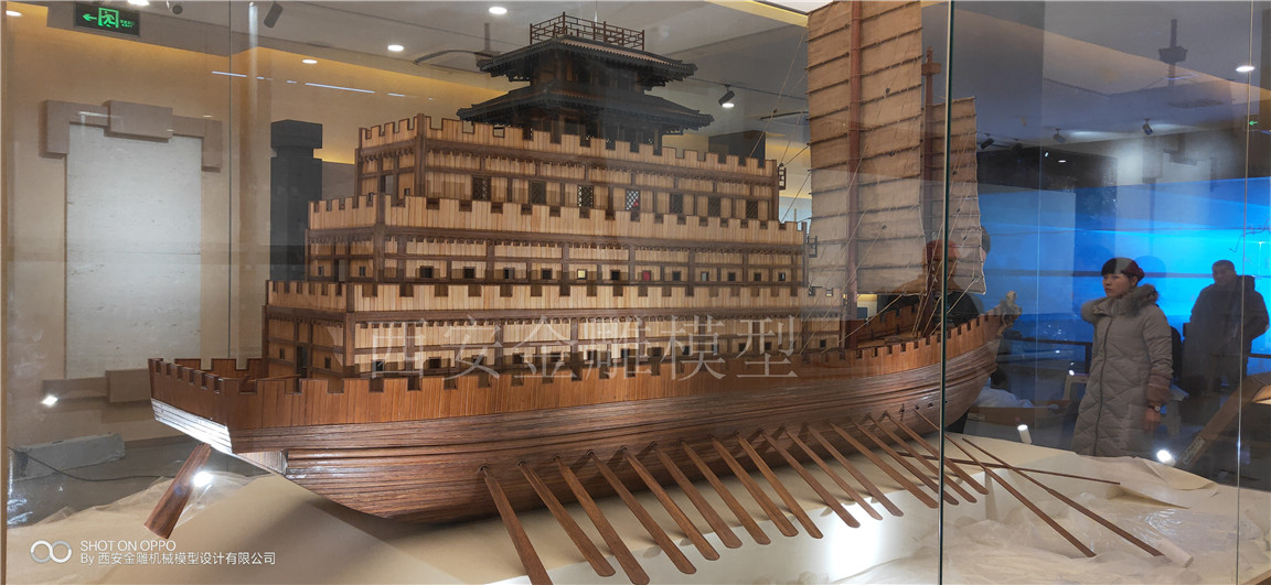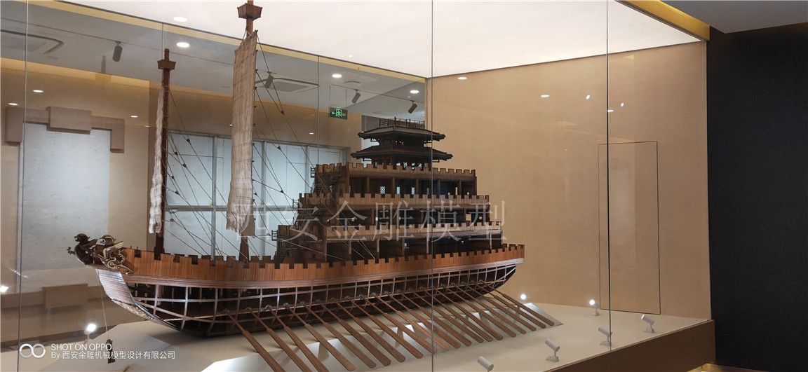 簡介—— 昆明池七夕公園文化展廳模型----漢代樓船模型,長4米,高2.5米,船體全實木制作,專業(yè)甲板木----柚木制作,船體木頭
